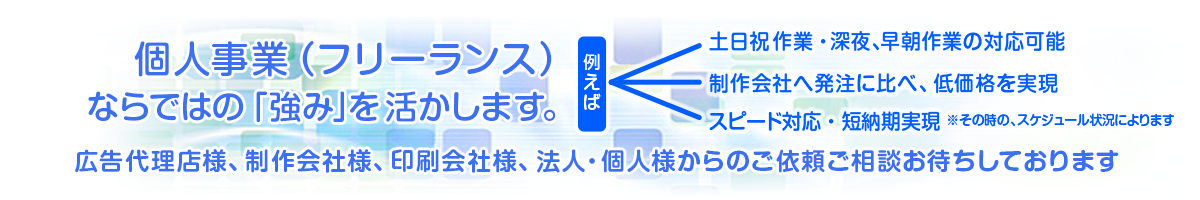 ホームページ制作、LP制作、バナー作成、ヘッダー画像作成、サムネイル作成などお請けしています。お客様のメリットを最重視し、「低価格で高品質のWEBサイト」を提供することを目指しております。 元々、WEB制作はメイン事業の一つでしたので、ノーコードでは無く、HTML+CSSからの細かい指定も可能です。(主に、Adobe Dreamweaver, Photoshop, Illustratorの連携で制作しています)