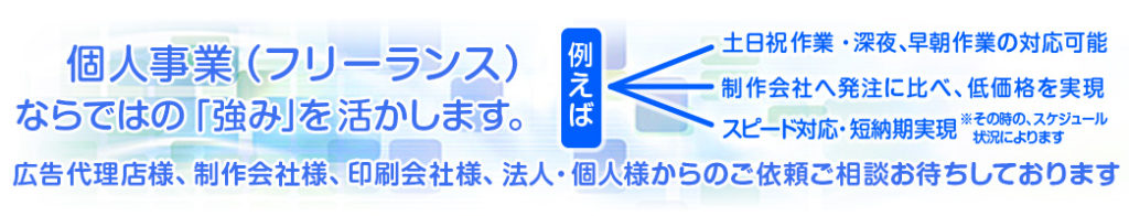 チラシ(フライヤー)、パンフレット、ポスター、取扱説明書、DM、新聞広告、展示物POP、リーフレットなどの広告媒体を版下データ作成し、AIデータ(Illustratorデータ)か、PDFデータでご納品します。ロゴ作成、ネオン、看板デザインなどもご相談ください。グラフィックデザインは、メイン事業の一つとして長年営んできました。デザインセンス、デザインクオリティはお任せください。
